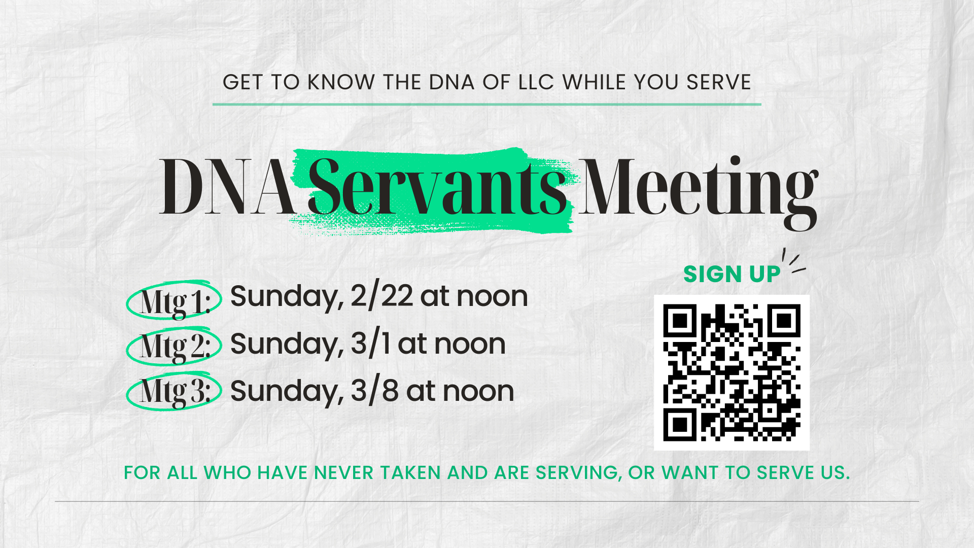 Join us on the following dates in the Family Room to learn more about the heart and DNA of our church. This is for anyone serving at LLC who hasn’t attended yet, or anyone interested in learning more about LLC.