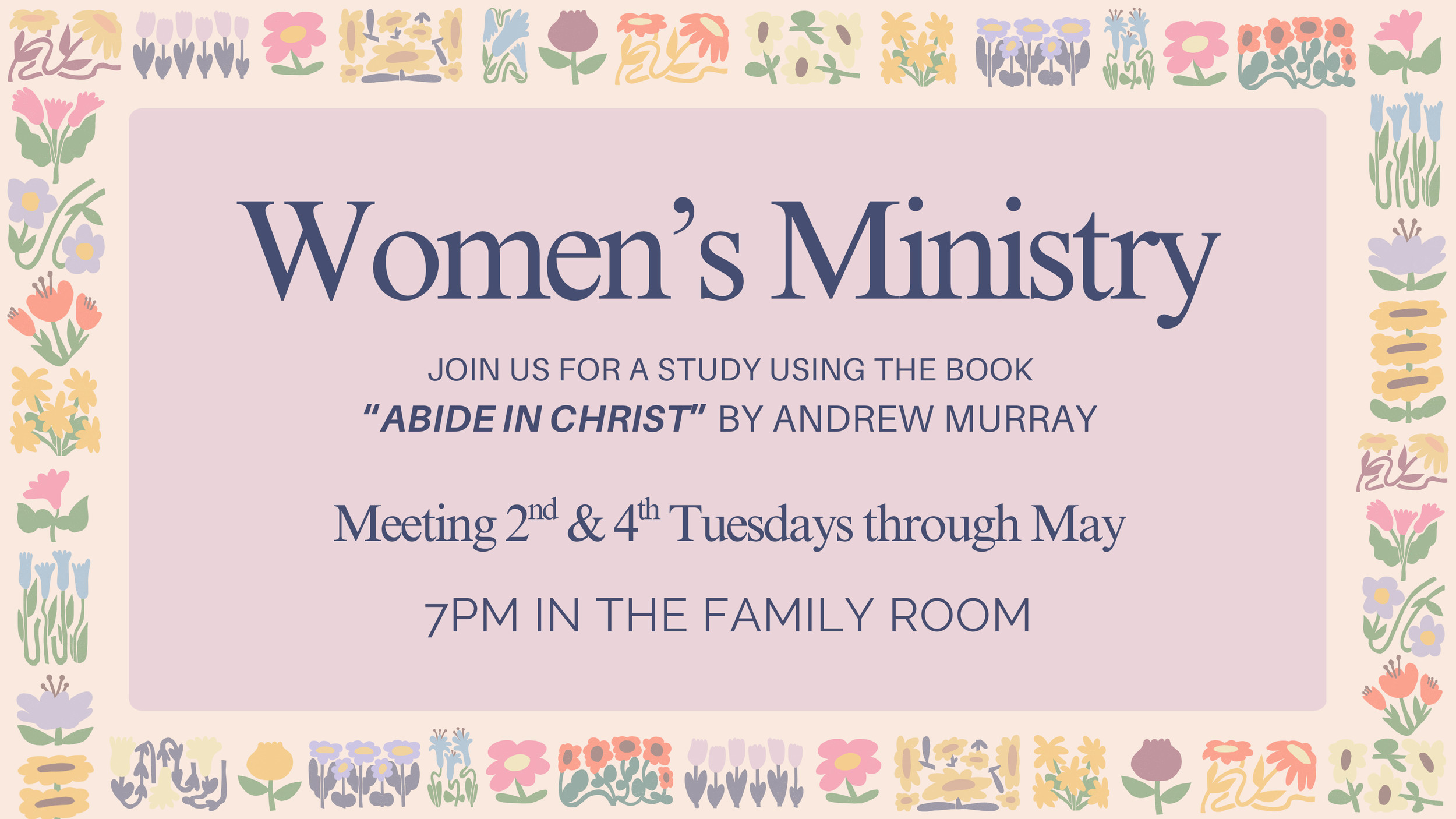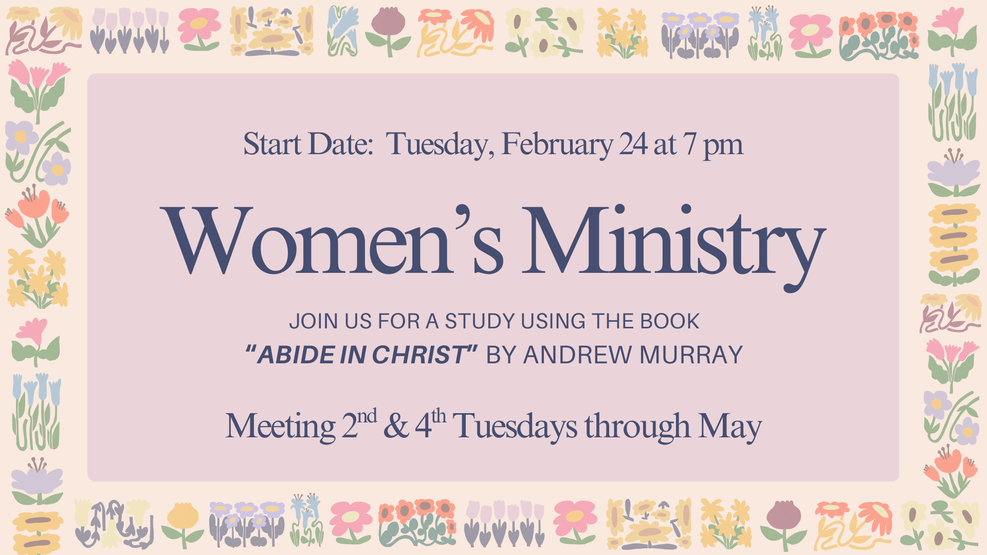 We invite all ladies to join us for a study using the book “Abide in Christ” by Andrew Murray. Starting on February 24th, we will meet on the 2nd & 4th Tuesdays of the month through May.